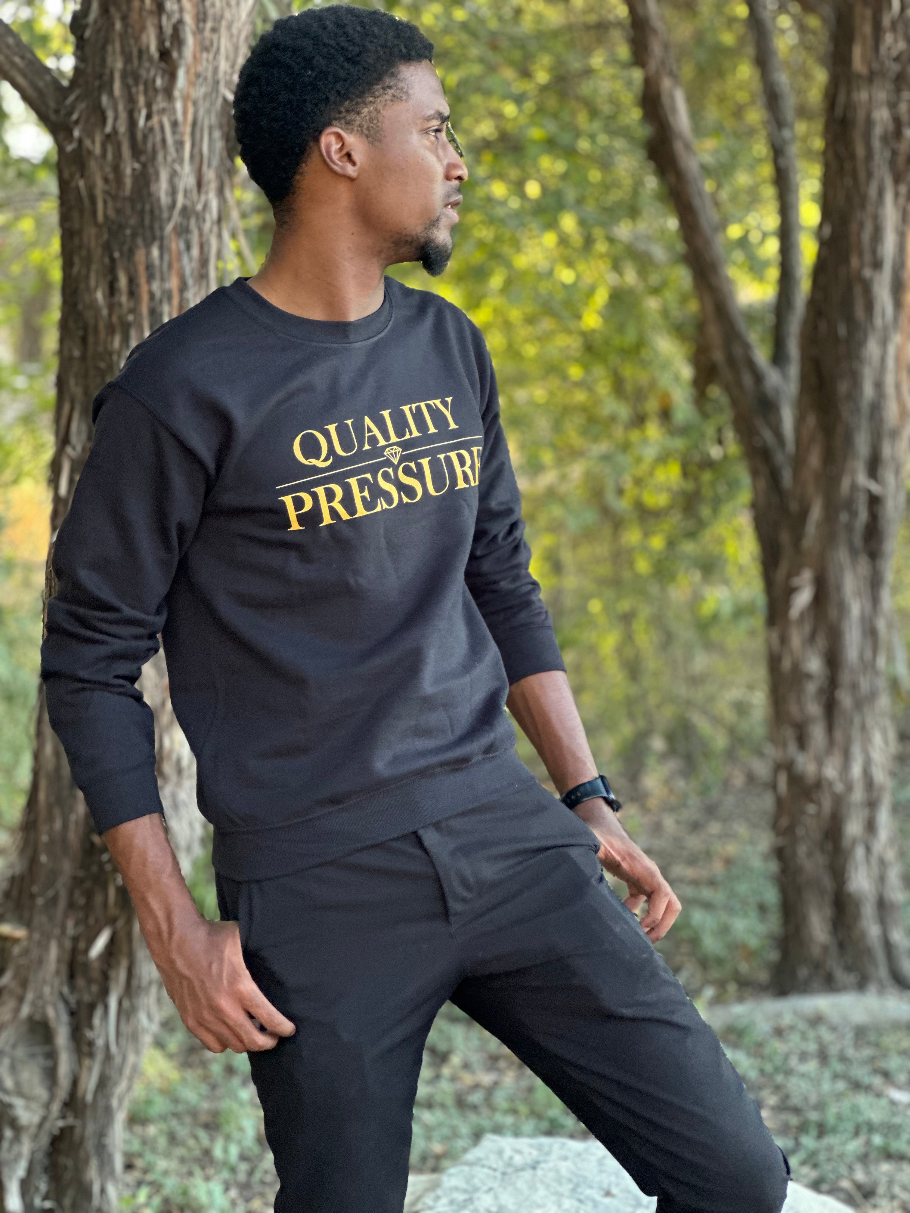 Step into confidence with the Quality Pressure Crewneck — a bold statement in black and gold. Crafted for comfort and built to last, this sweatshirt embodies the balance between luxury and grind. Featuring the signature diamond-lined logofront and center, it’s a reminder that pressure creates quality.